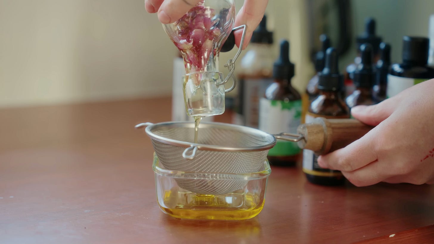 Once the rosebuds have finished infusing in the jojoba oil, the next step is turning it into a simple face oil. I like keeping my skincare uncomplicated, especially in winter when we tend to feel less energetic.